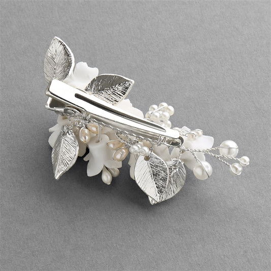 Wedding Hair Clip with White Resin Flowers, Pearls Matte Silver Leaves