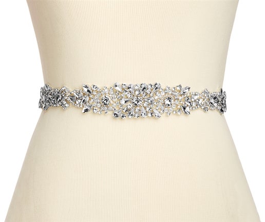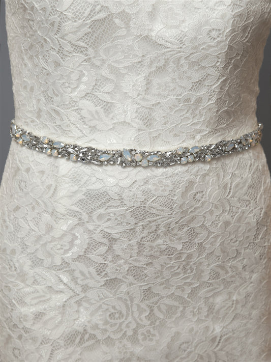 4611BT-I-S Silver Mosaic Bridal Belt with White Opal Crystals & Ivory Ribbon