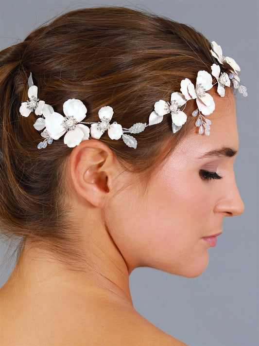 Bridal Hair Vine Headpiece with Ivory Enamel & Matte Silver Metal Flowers & Opal Crystals