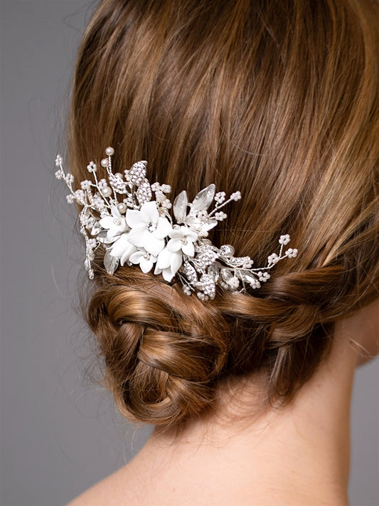 Best Selling Bridal Hair Comb with White Resin Flowers, Crystals and Dainty Pearl Sprays