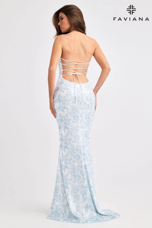 NEW! Faviana Strapless Sequin Dress with Blue and White Floral Print