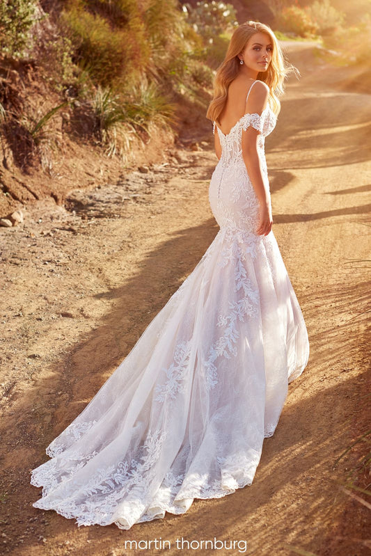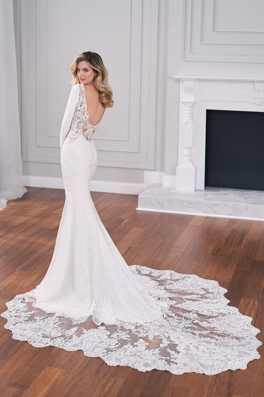 122180 Crepe Fit & Flare Off Shoulder Long Sleeve Wedding Dress by Enchanting for Mon Cheri