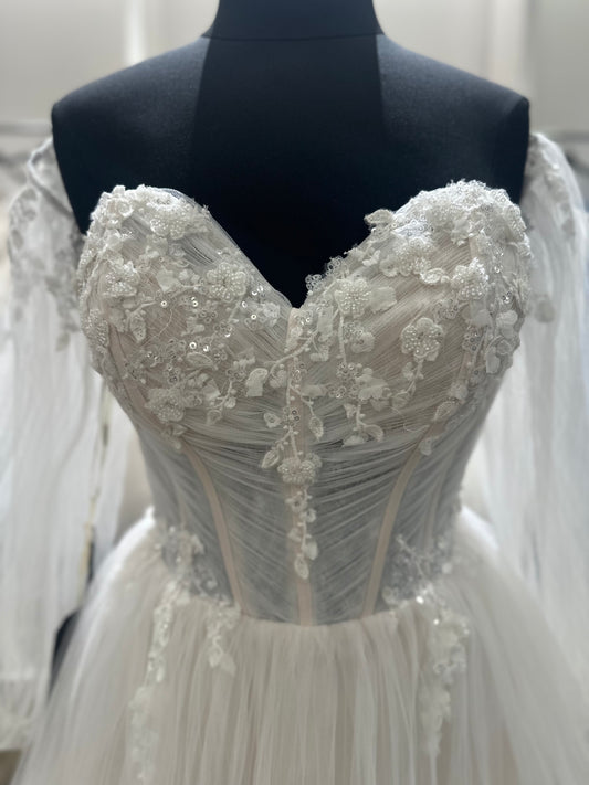 Our gowns are inspected by three different staff before shipment. For sample gowns, please know that these may have imperfections. A virtual appointment is highly encouraged so that you may preview the gown before you purchase it.