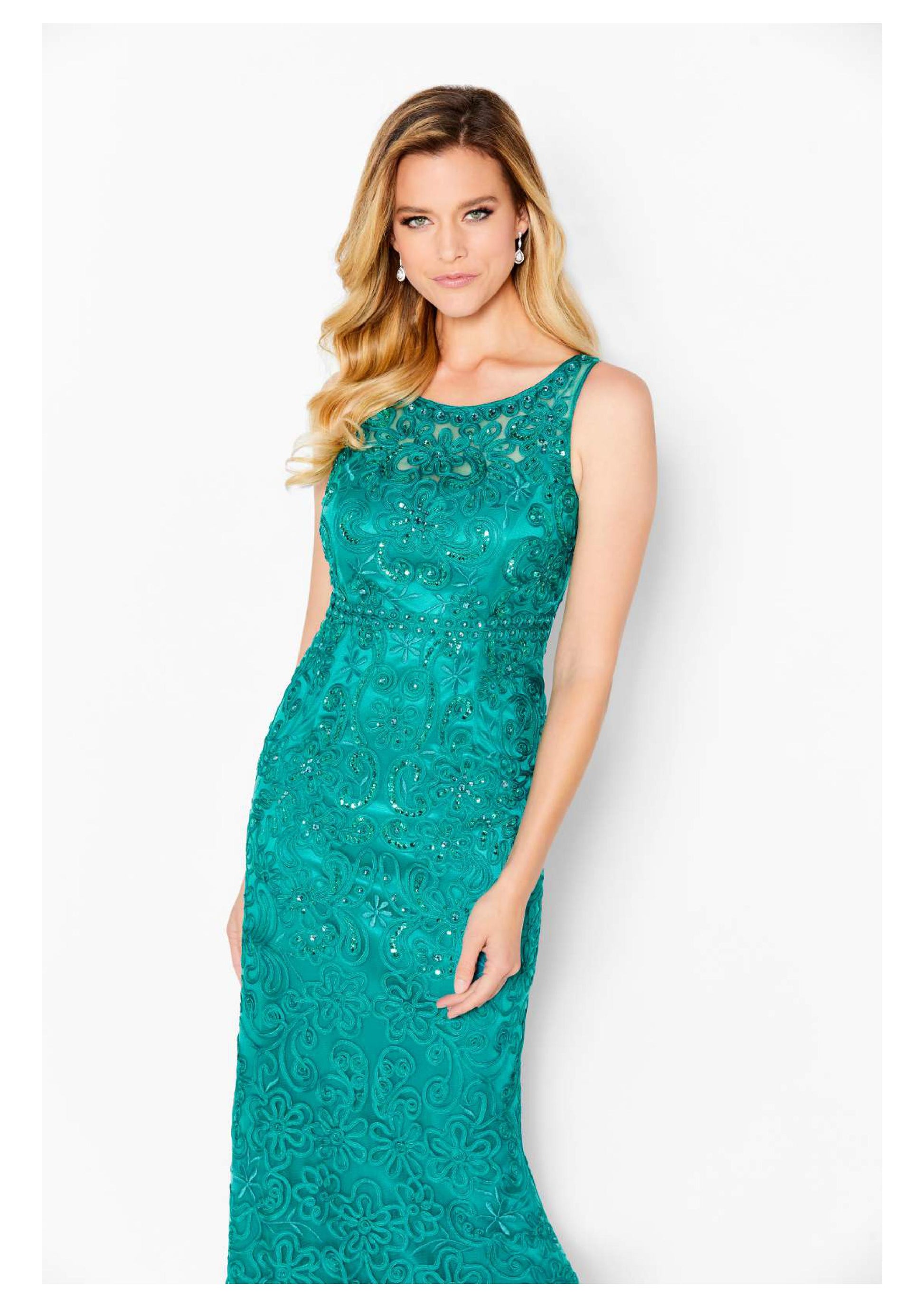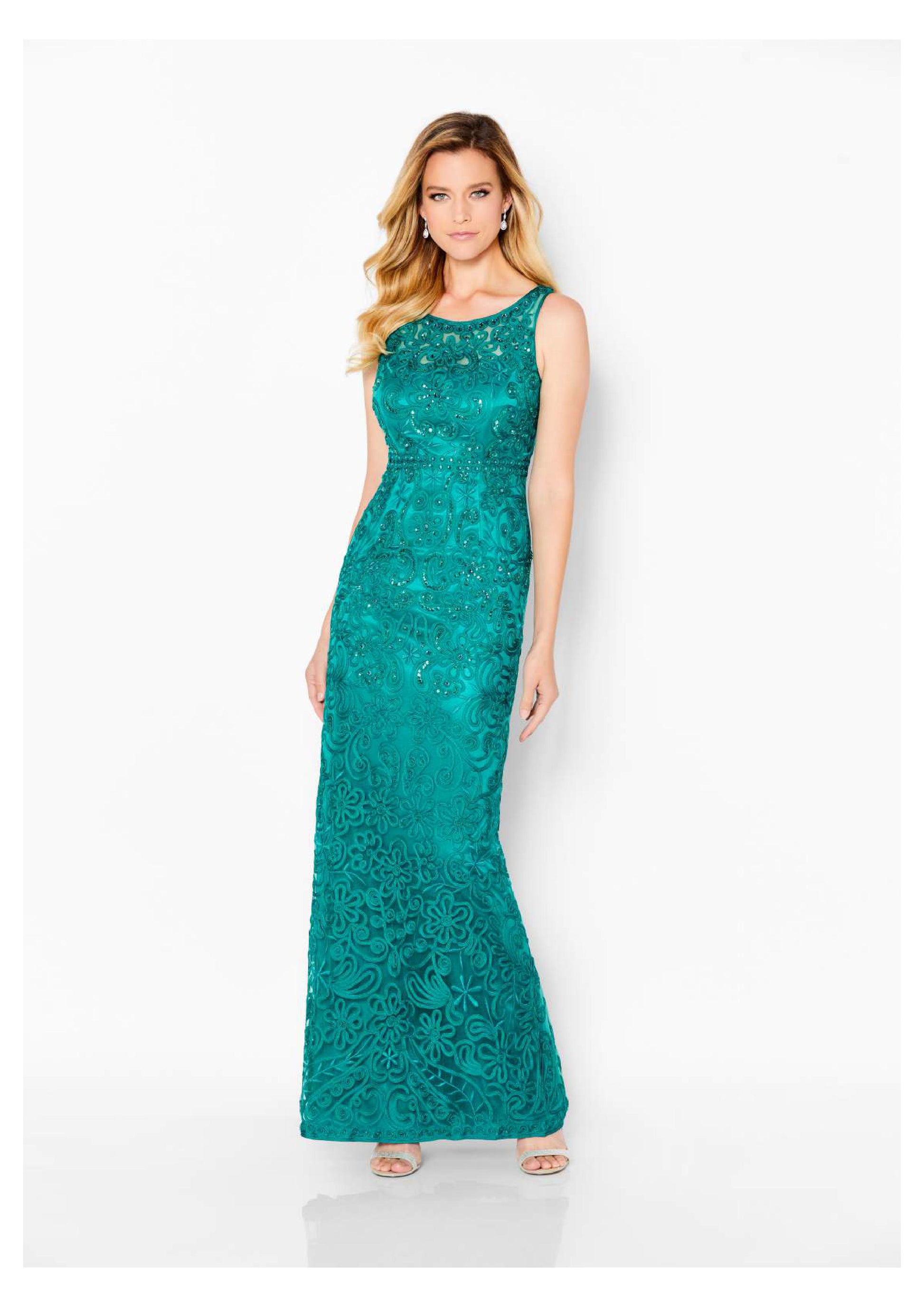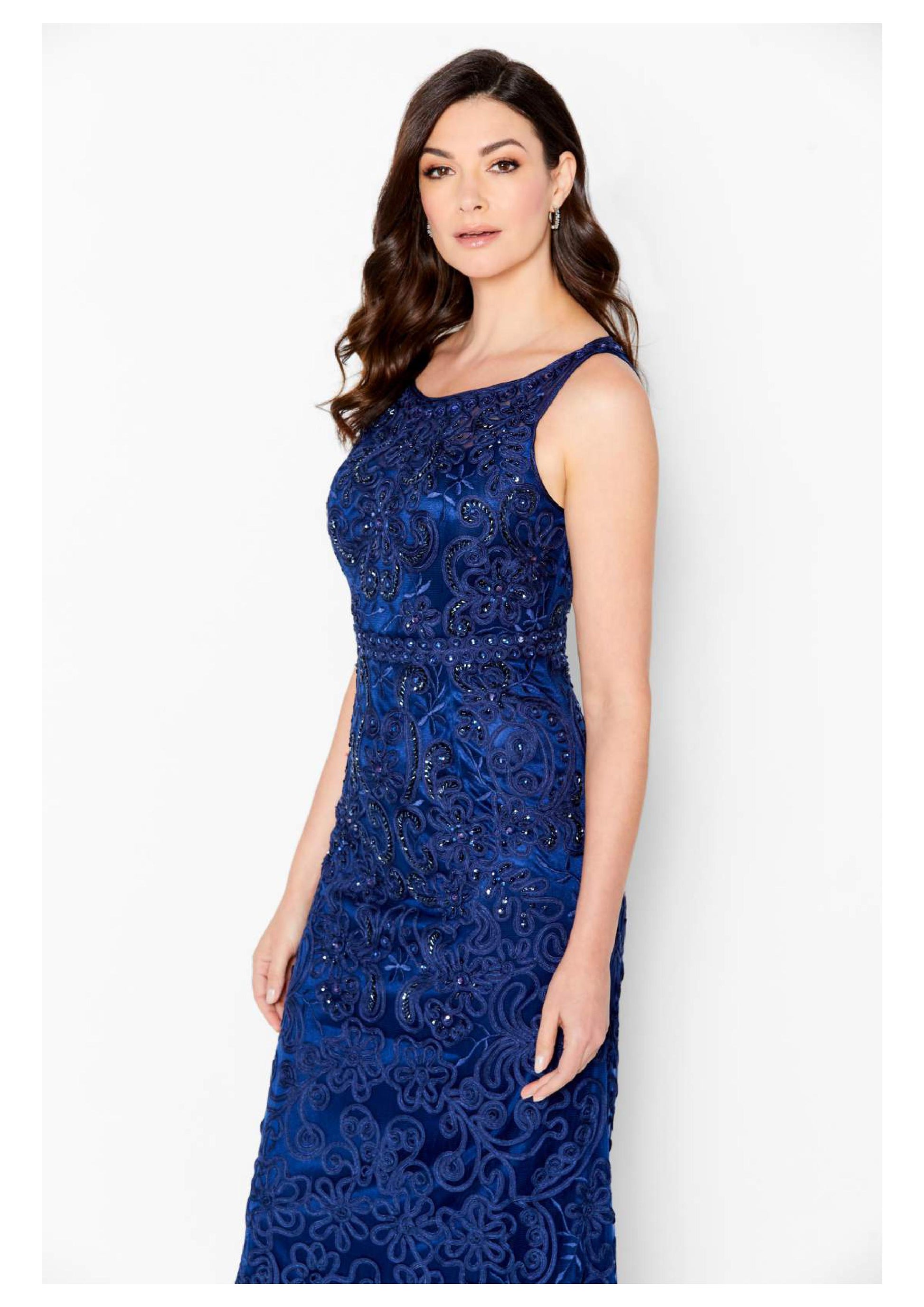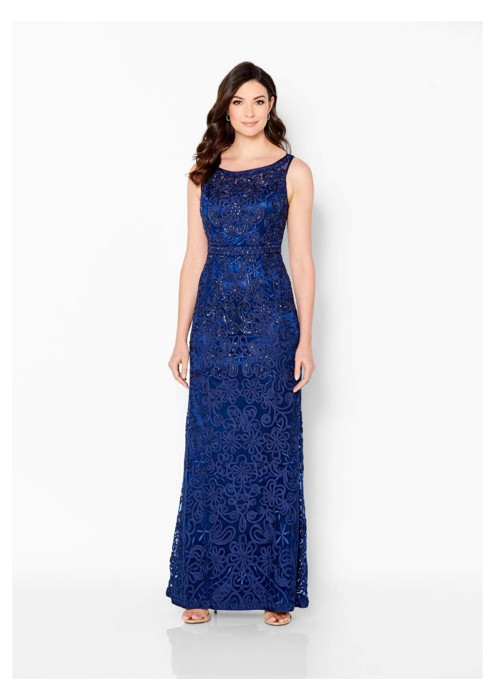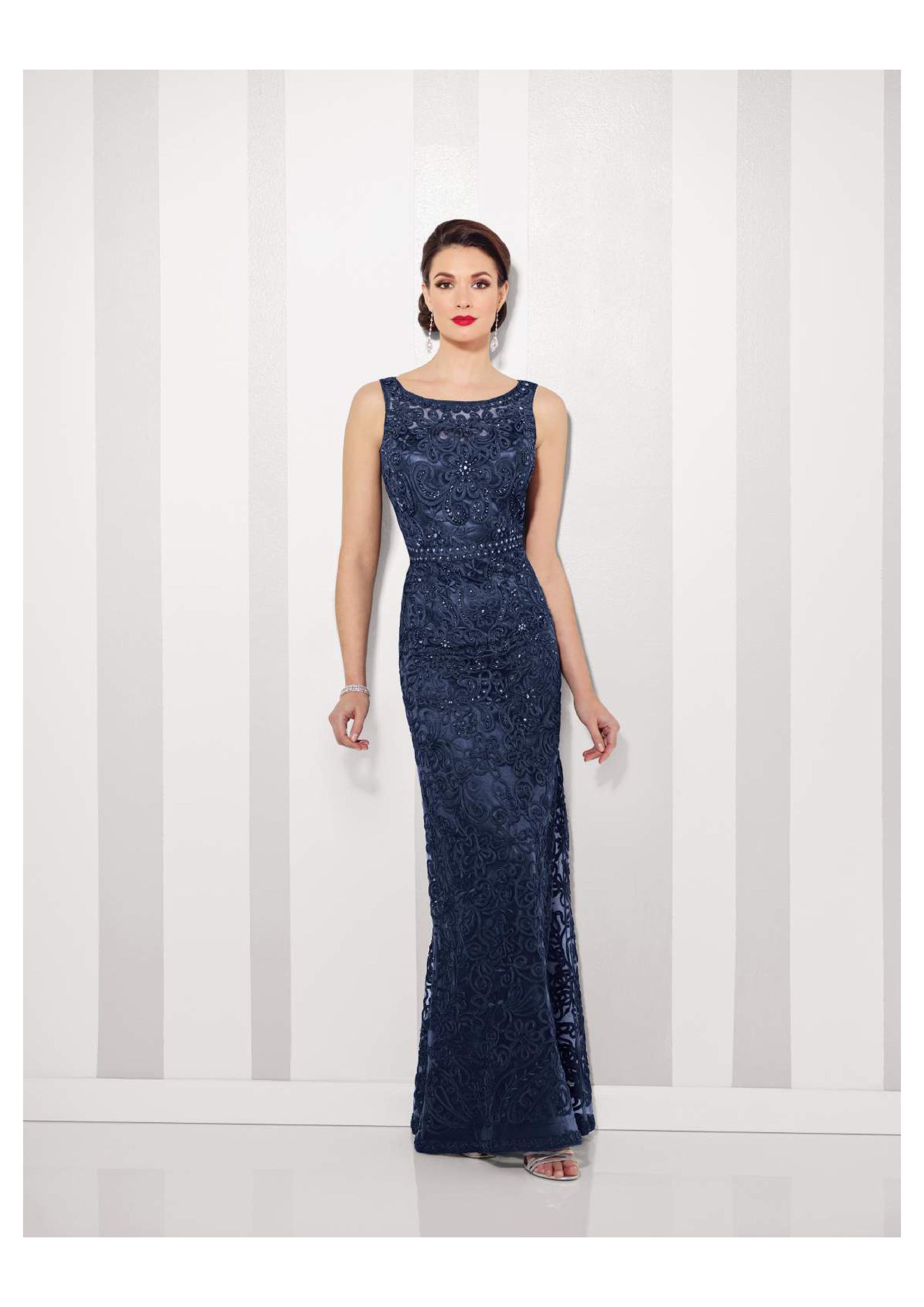 Sleeveless ribbon on tulle slim A-line gown with illusion curved bateau neckline and illusion back, hand-beaded high waistline, slightly flared skirt. Designed by Cameron Blake