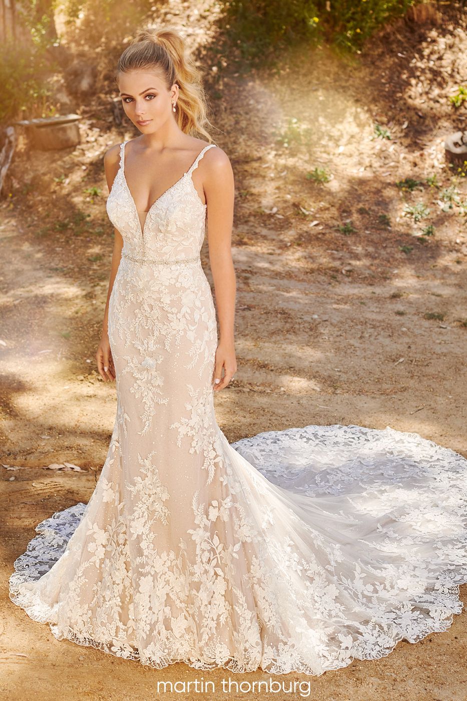Sleeveless lace and sequin tulle fit and flare bridal gown features beaded spaghetti straps, curved V-neckline, open low back, beaded belt detail at natural waist, stretch lining, shaped chapel train with scalloped hem lace.
