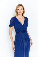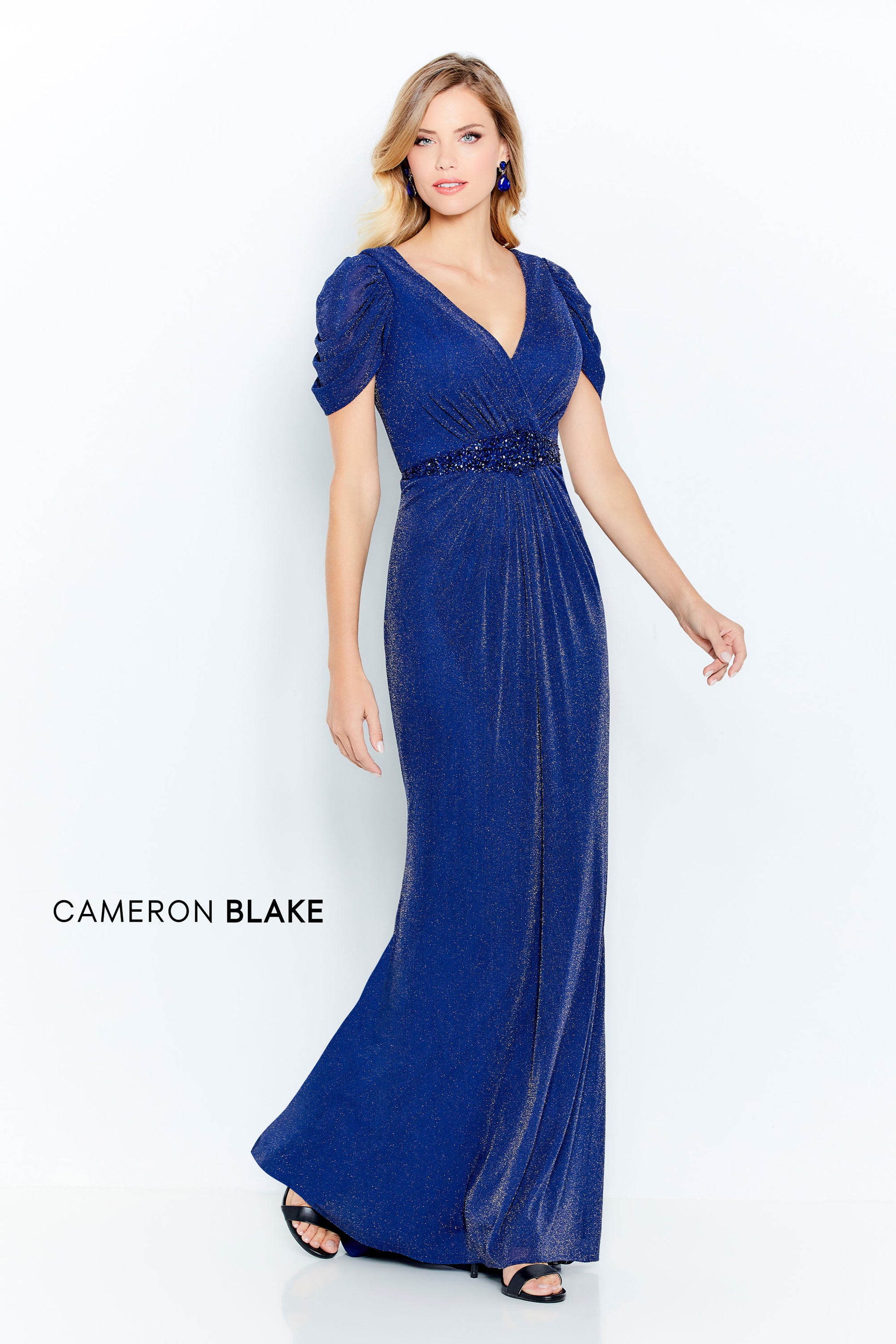 Look stunning AND comfortable in this Cameron Blake Sheath dress! Its gold shimmery red jersey is ruched to perfection and adorned with gorgeous beading around the natural waistline. Feel beautiful in the V-neckline and back design with a surplus bodice. The ruching down the front and back slim skirt is finished with a sweeping train.