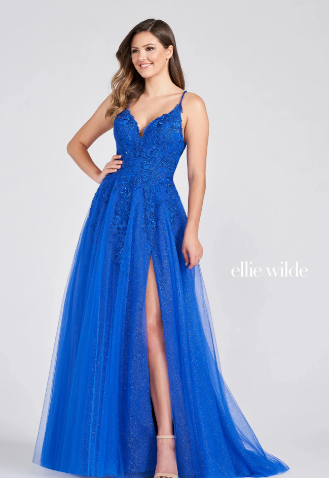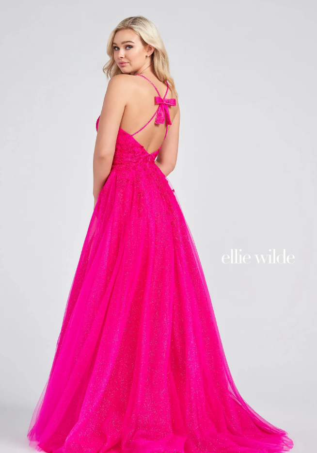 Be the belle of the ball in the 122014 Ellie Wilde A-Line Prom dress. This stunning gown features a v-neck, embroidered tulle, and a leg slit for added flair. Plus, pockets for convenience and a bow for a playful touch. Perfect for standing out from the crowd!