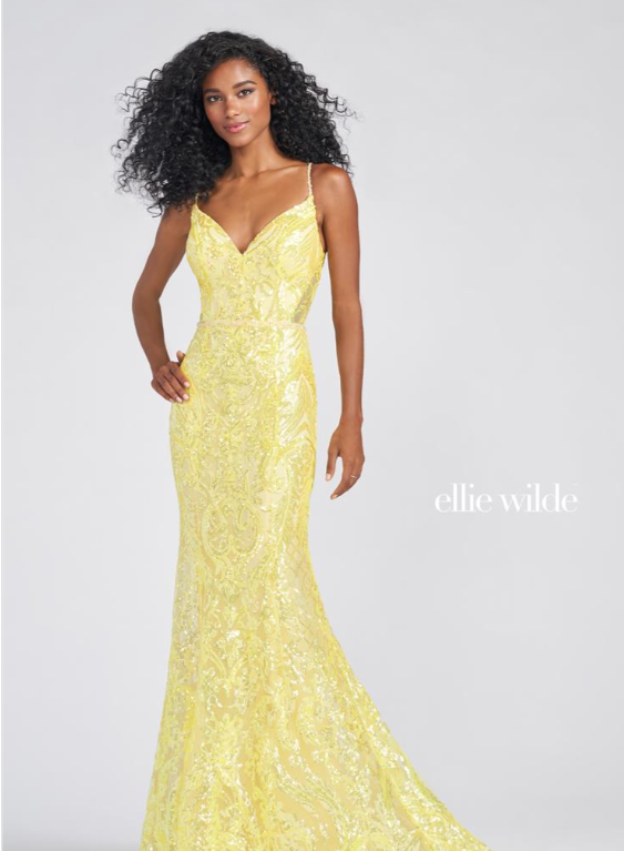 Make a statement in this long fitted dress EW122022 from Ellie Wilde. Made in bold neon colors, this sequins dress has a v neckline. The back of the dress has an open back and sheer illusion material decked in sequins. A gorgeous pattern of sequins appliques adorn the dress from top to bottom and a bead belt defines your shape.