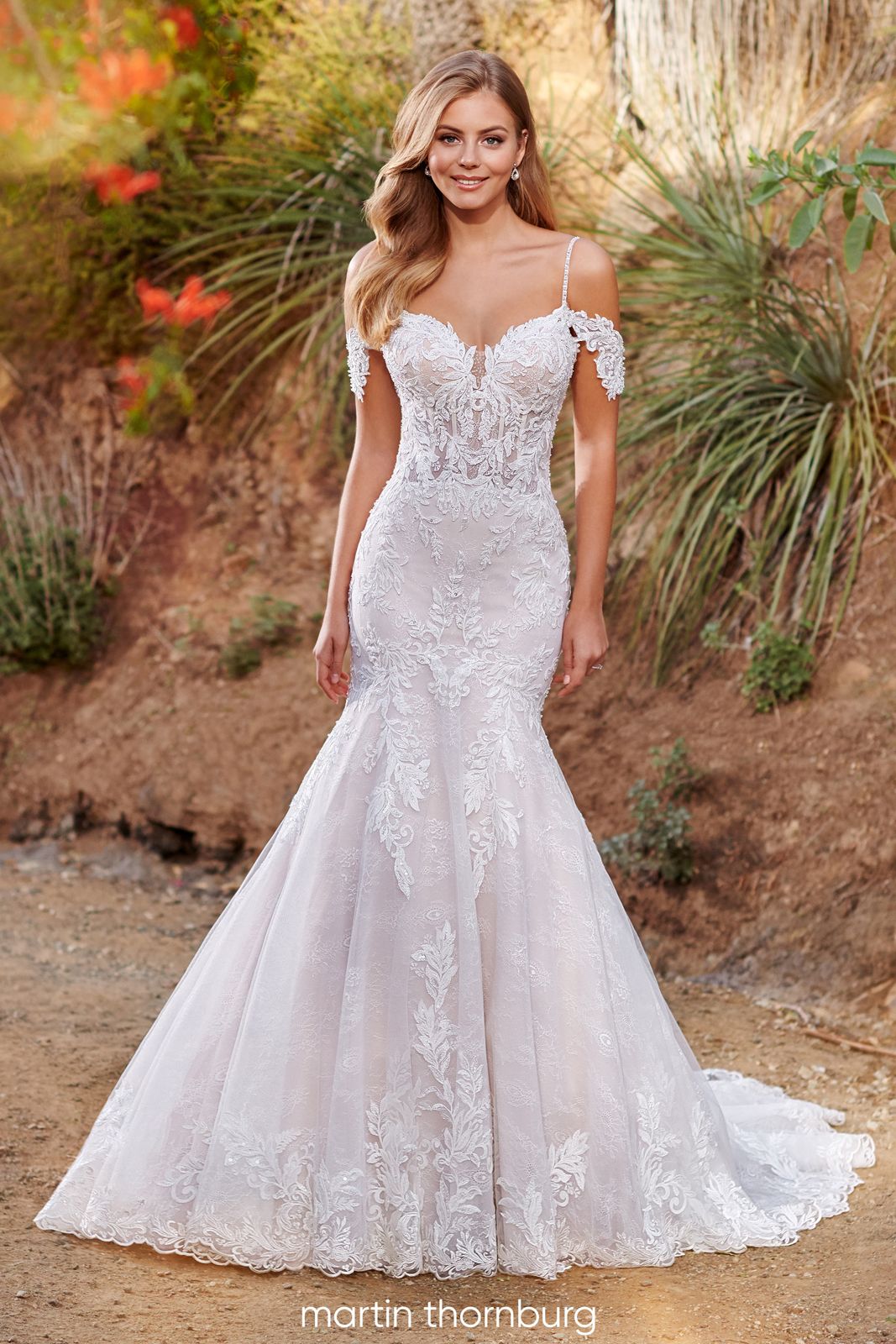 Sleeveless lace and tulle mermaid bridal gown features beaded Schiffli lace over allover lace, sweetheart neckline, sheer corset bodice, beaded spaghetti straps, detachable lace cold shoulder straps, covered buttons along zipper back, fitted through waist and hips, stretch lining, scallop hem, chapel train.