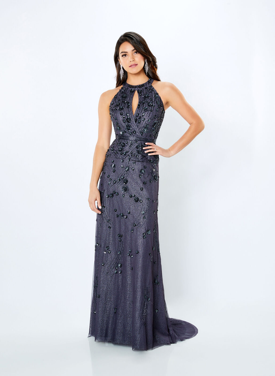 La Valetta by Mon Cheri LV22107 formal dress is styled in floral beaded tulle, featuring a surplice bodice with a keyhole jewel neckline and cut-in shoulders. The beaded waistband and the fitted peplum add flair to this column silhouette evening gown, finished with a sweep train.