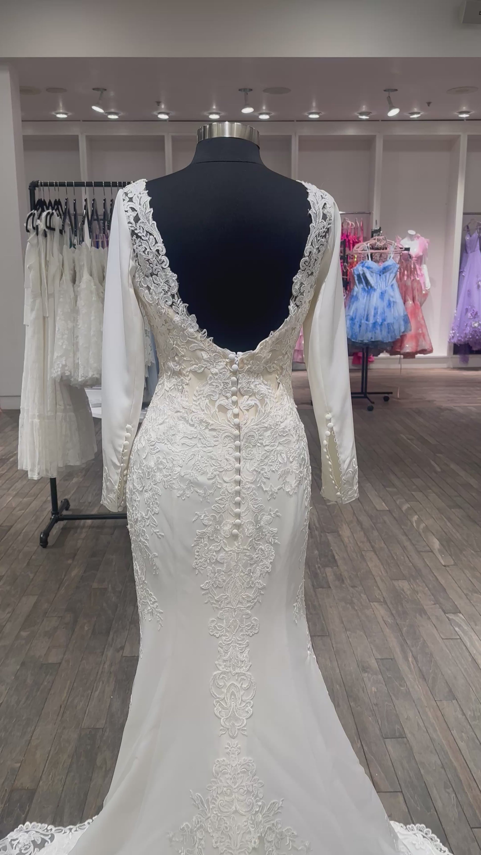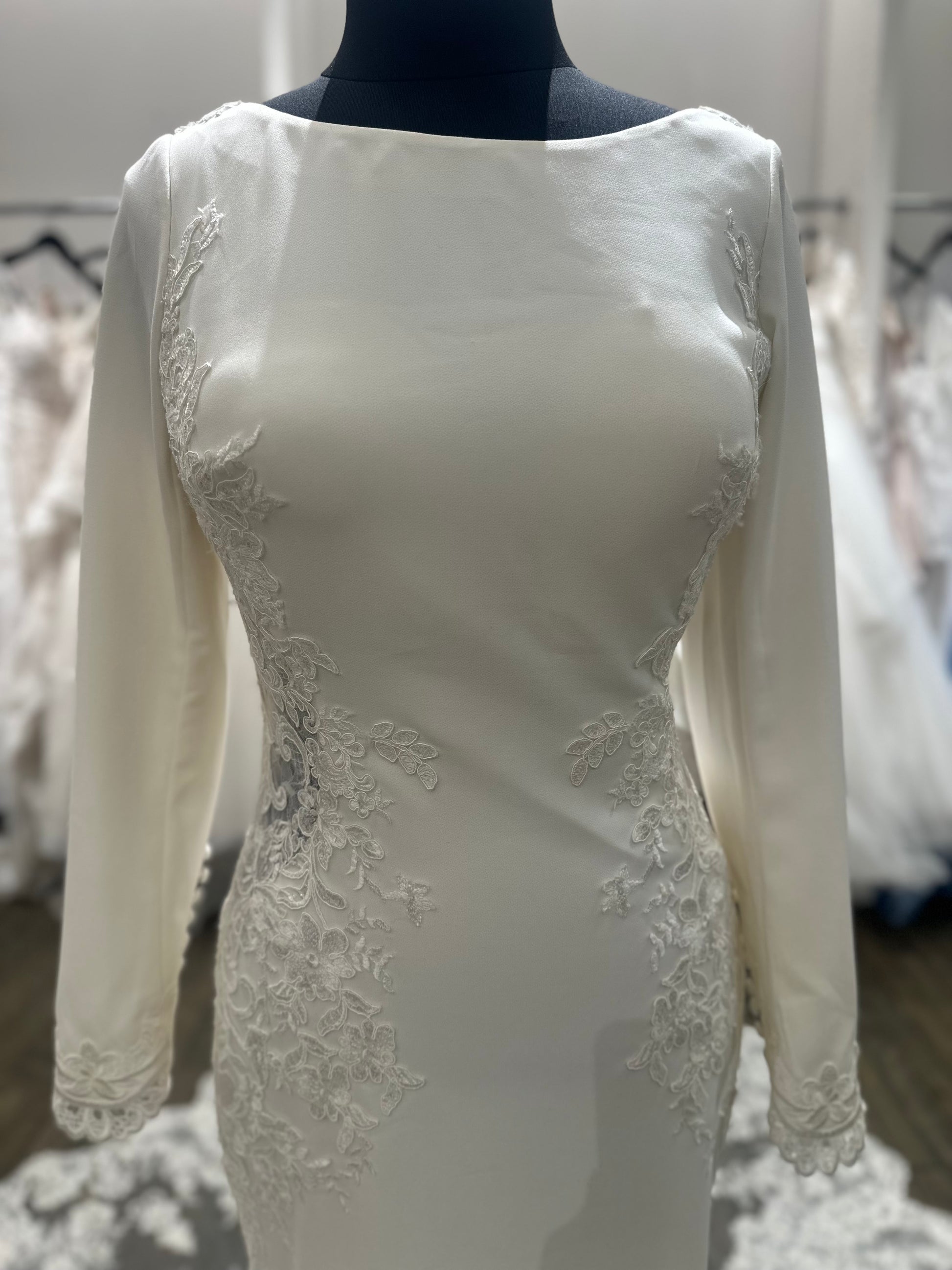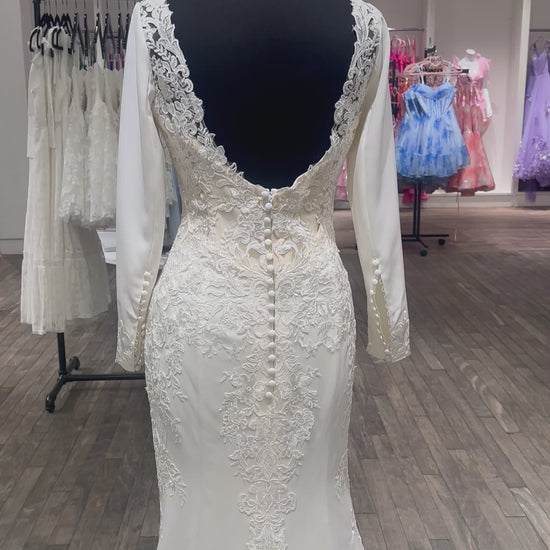 Sophisticated, Sleek and Sexy. Crepe and lace fit and flare bridal gown features long sleeve with lace trim and covered buttons, soft bateau neckline, semi sheer back bodice with double embroidered Schiffli lace and sequin appliqué, covered buttons, crepe skirt with shaped cutout allover lace and appliqué, stretch lining, chapel train.