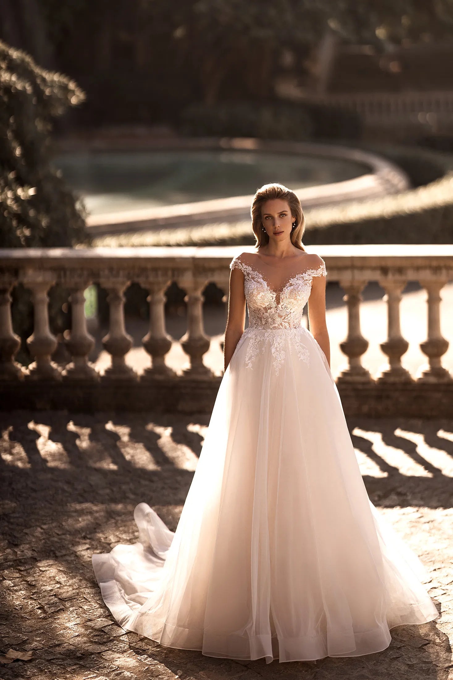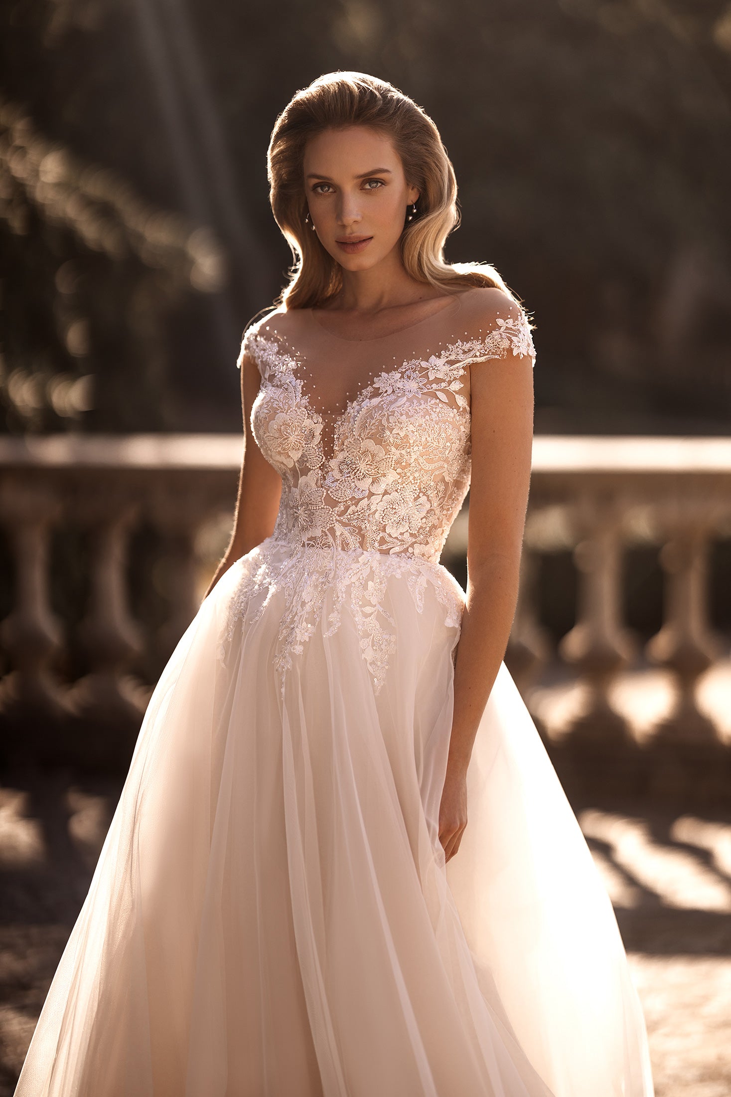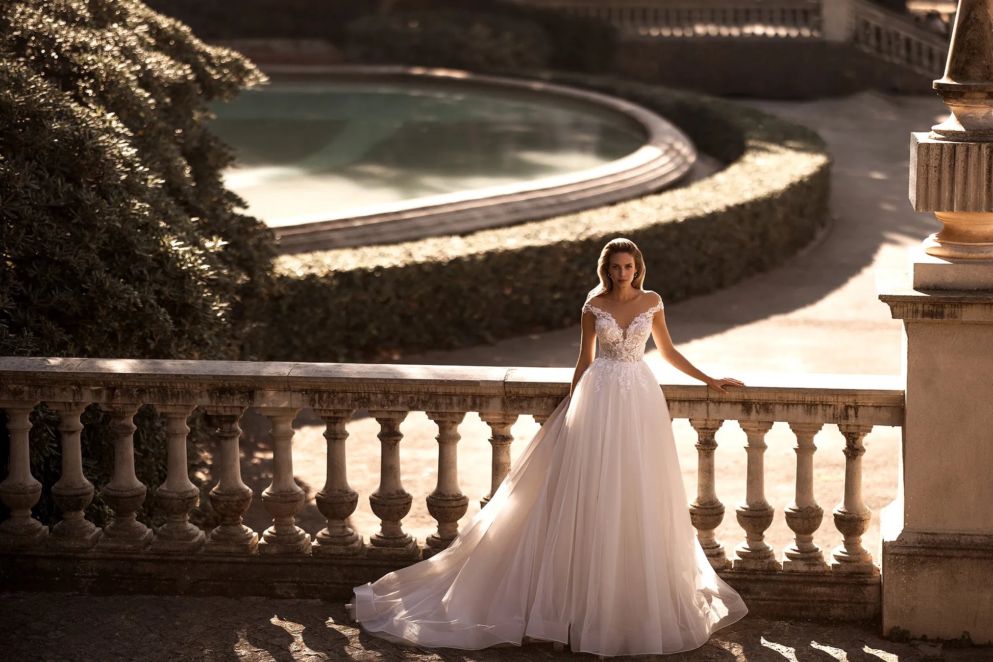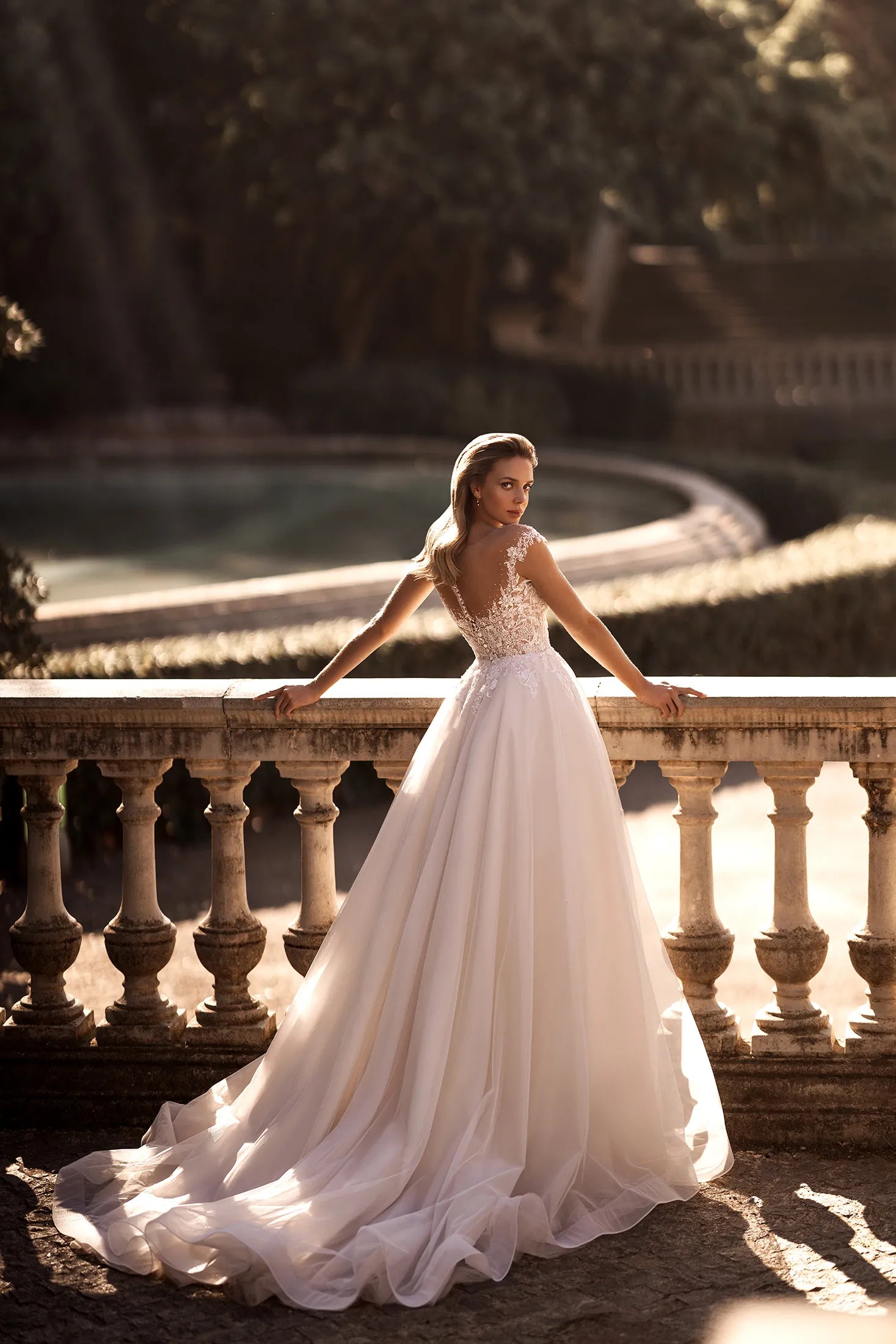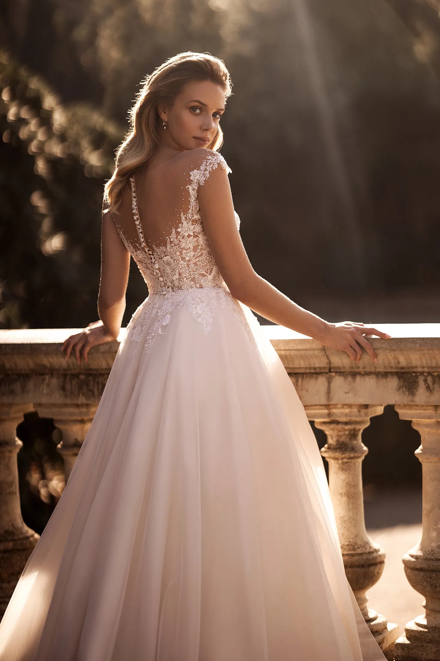 The Vicenza A-line style features a stunning beaded flower lace that adorns the bodice and trails over an illusion neckline to the shoulders, creating a delicate and feminine look. The lace continues onto the skirt over the waistline, adding a touch of glamour to the simple, flowing skirt. The neckline is hand-beaded, adding even more intricate detail to the dress. The skirt is plain and flowing, with a chapel train that adds a touch of drama to the look. The bottom hem is finished with a delicate horsehair braid, adding structure and weight to the skirt.