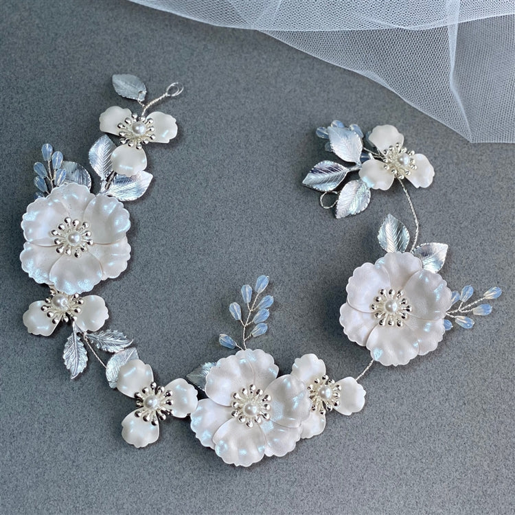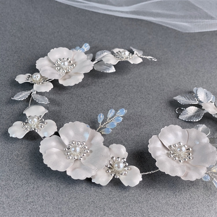 Bridal Hair Vine Headpiece with Ivory Enamel & Matte Silver Metal Flowers & Opal Crystals