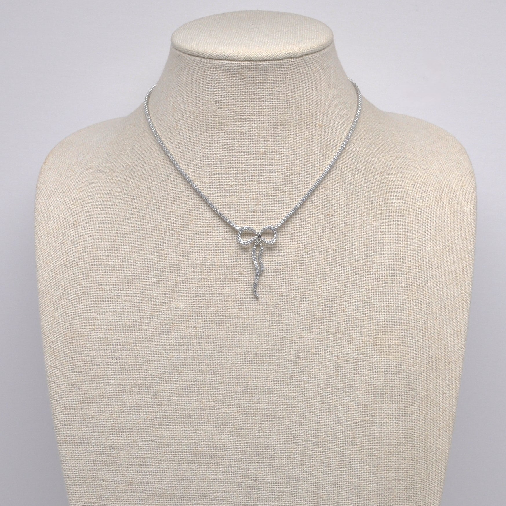 The CZ Silver Bow Necklace offers refined elegance through its delicate bow design accented with radiant cubic zirconia stones. Crafted in polished silver, this necklace brings a subtle yet sophisticated sparkle, ideal for enhancing both formal and everyday ensembles. Its graceful simplicity makes it a timeless piece that complements any style with understated luxury.