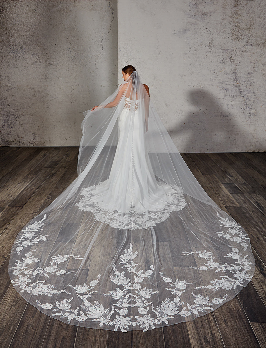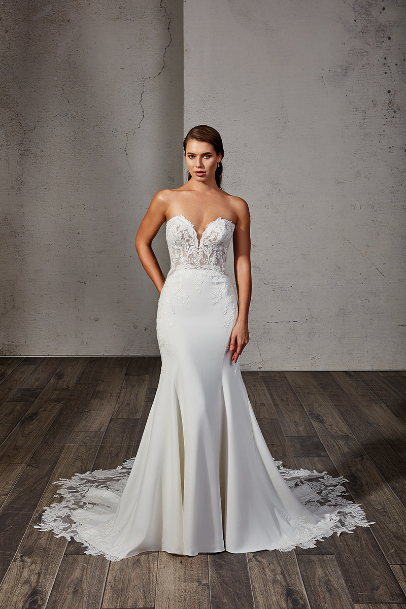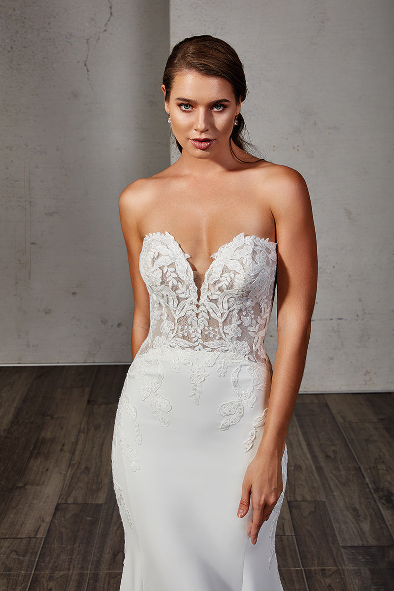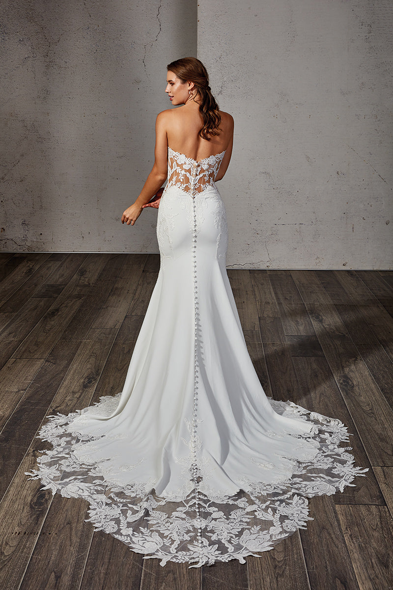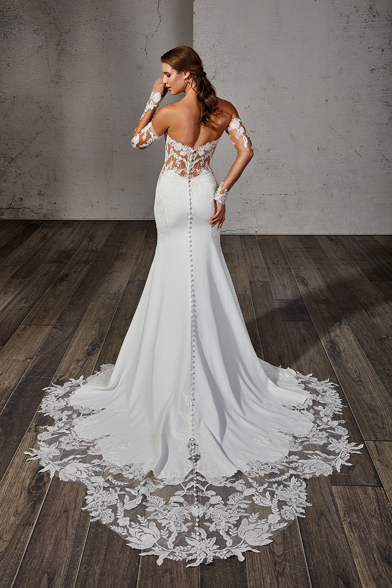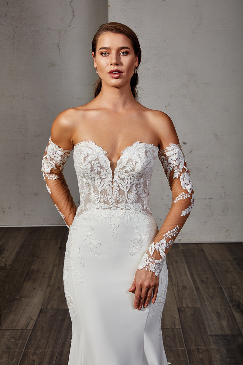 2049Crepe mermaid gown with ivory lace and sequins over ivory-champagne-skin unlined bodice with Chantilly lace, ivory stretchy lining, buttons to end of train, detachable swag sleeves.
