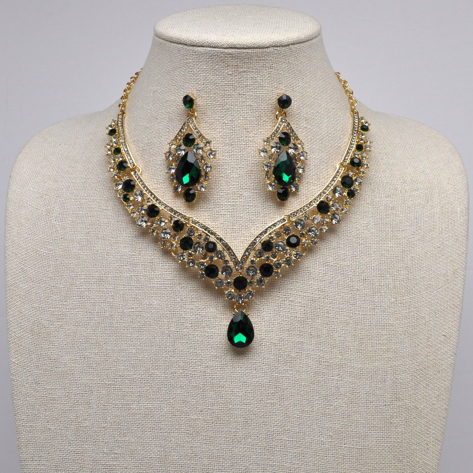 This matching set features a pair of dangling earrings and a necklace adorned with sparkling emerald-green stones, offering an elegant design perfect for formal or special occasions. Crafted for timeless sophistication, this set adds a refined touch to any ensemble.