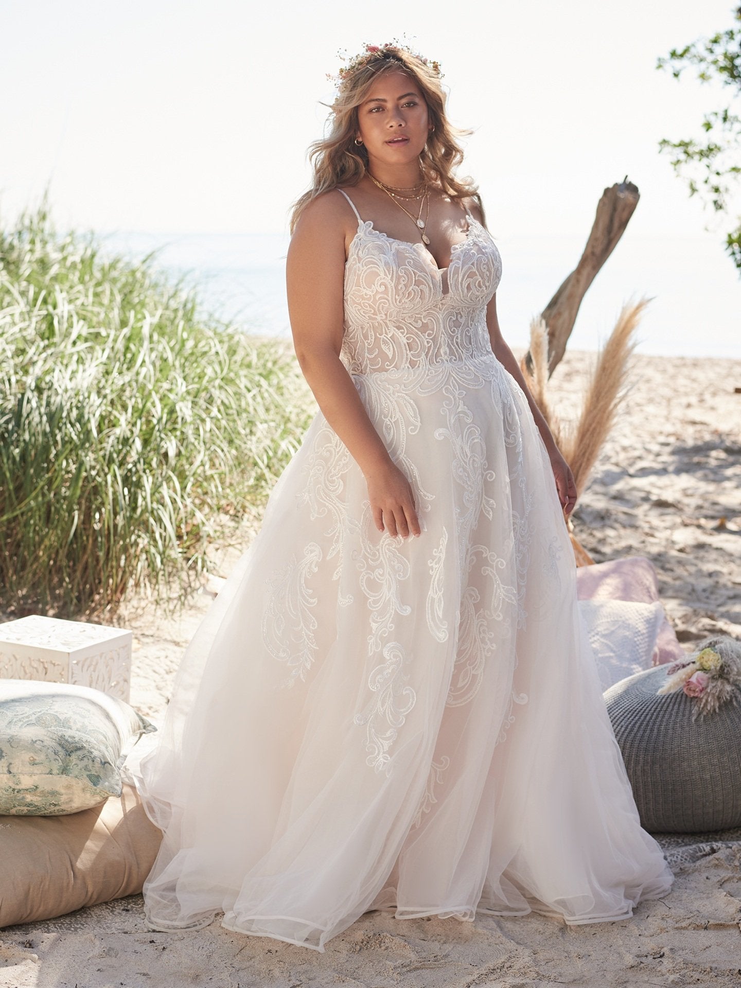 Fall in love with the romantic beauty of the "Katiya" wedding dress by Maggie Sottero. Featuring a glamorous deep sweetheart neckline and a sheer bodice, you'll be twirling in its layers of airy tulle and gracefully cascading ruffles. Experience your wedding day in a gown that radiates elegance and timeless beauty.