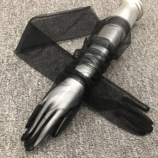 Delicate, high-quality long sheer ivory or black gloves. Easily designable if you wish to sew on faux pearls, flowers, sequins, and many more pieces to make it absolutely unique. Perfect for brides to wear at formal events such as weddings or parties. Gloves are stretchable and are intended to fit all sizes. Measurements: Length: 27" when laid flat Palm width: 3.5" Arm opening: 4.5"