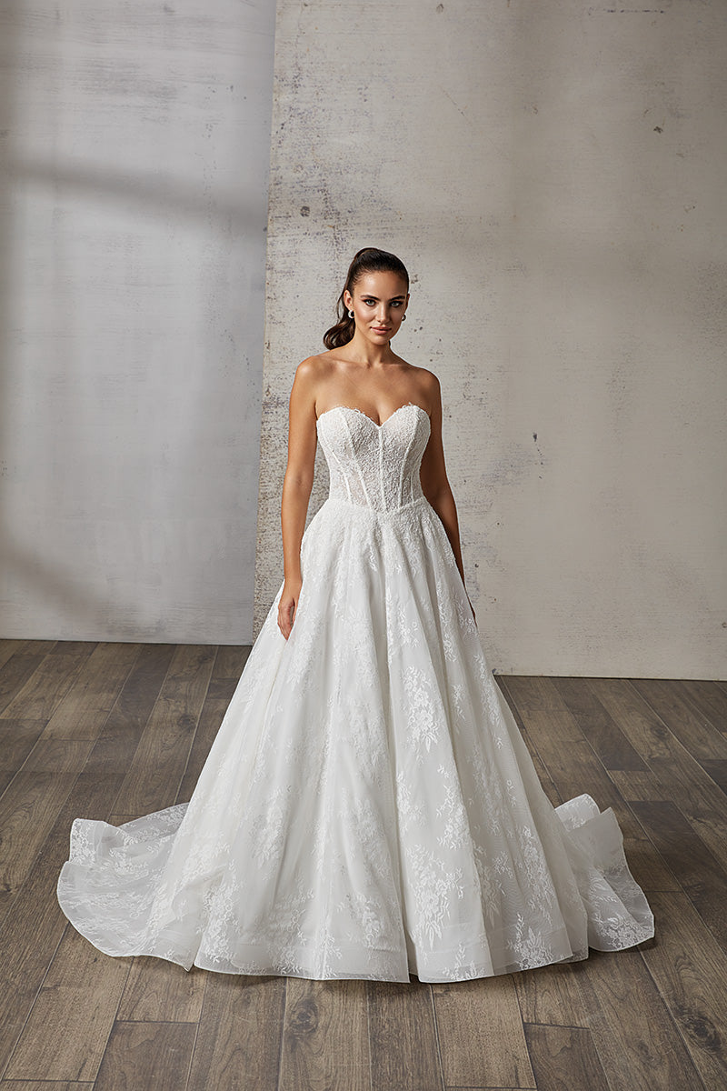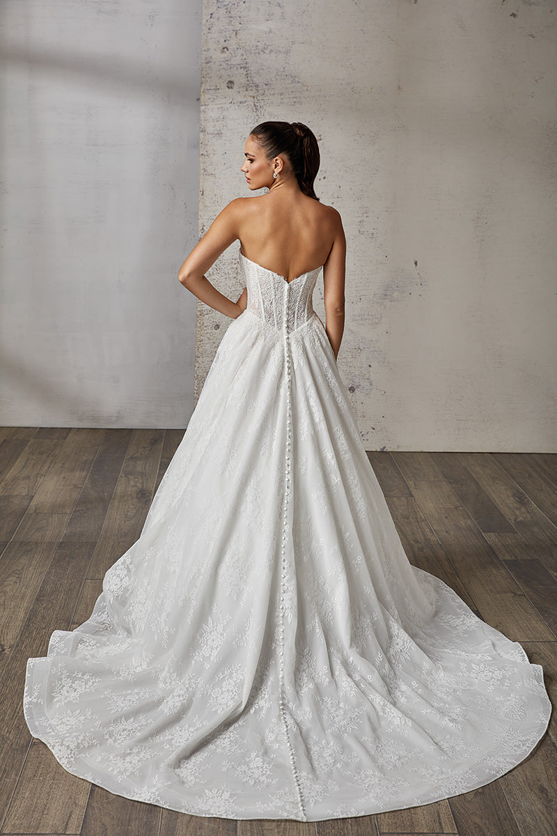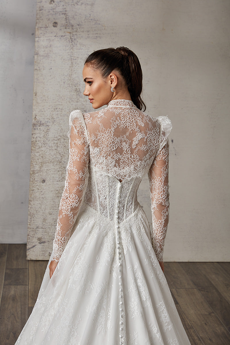 Ivory Chantilly lace ballgown with corded lace around bodice, ivory tulle, unlined corset bodice, basque waist, buttons to end of train .