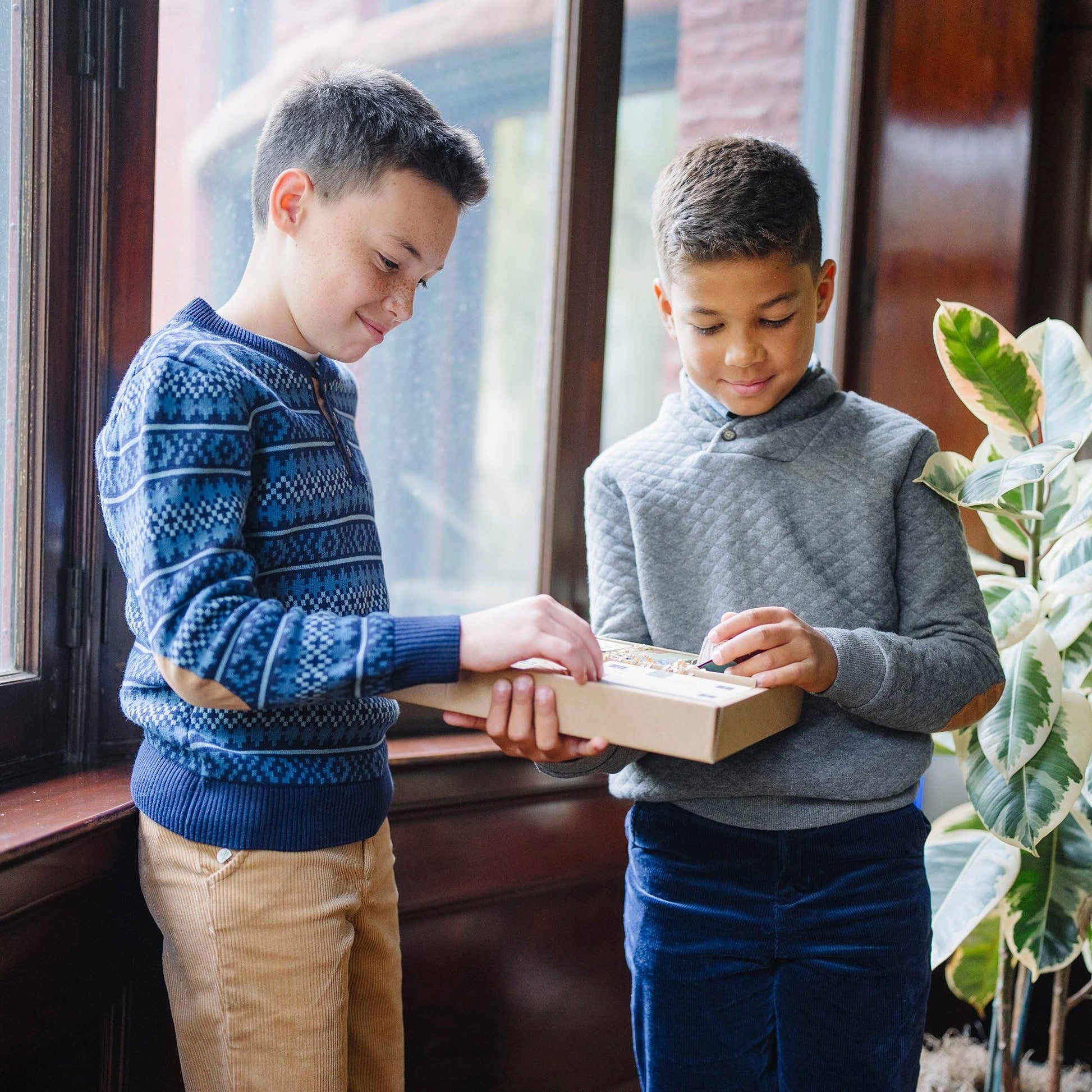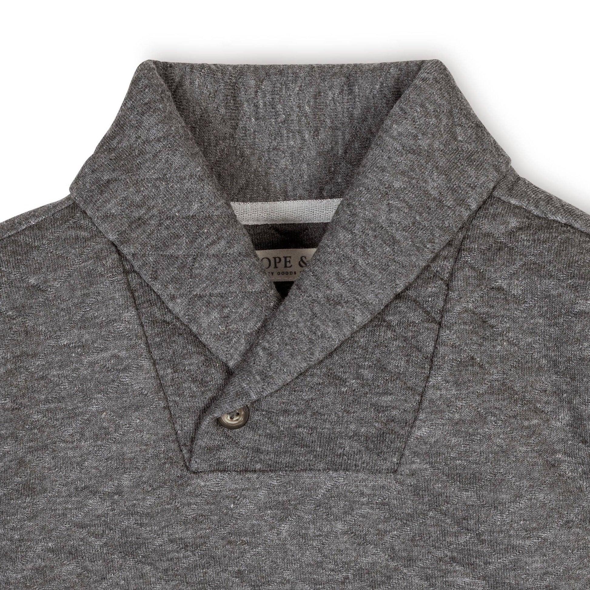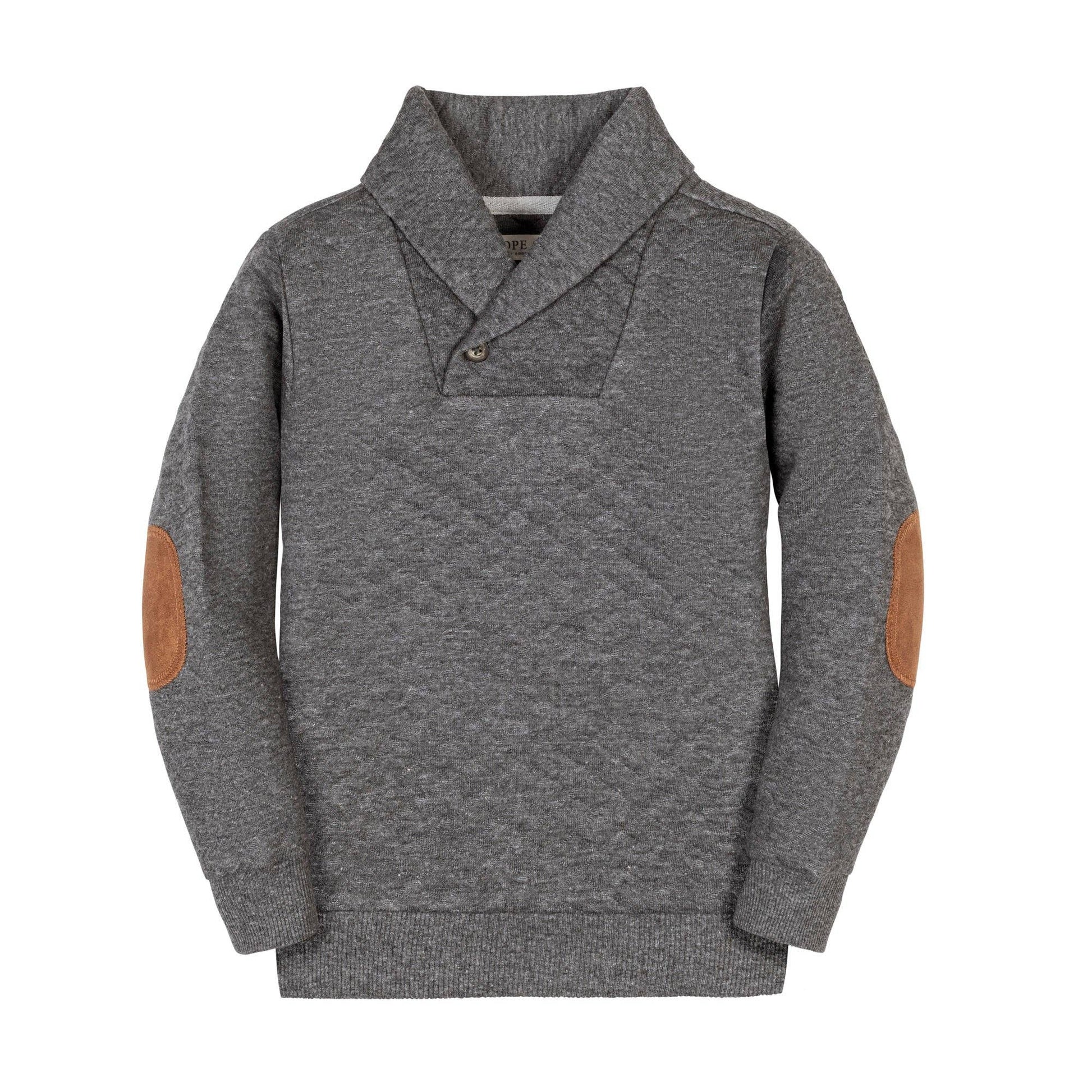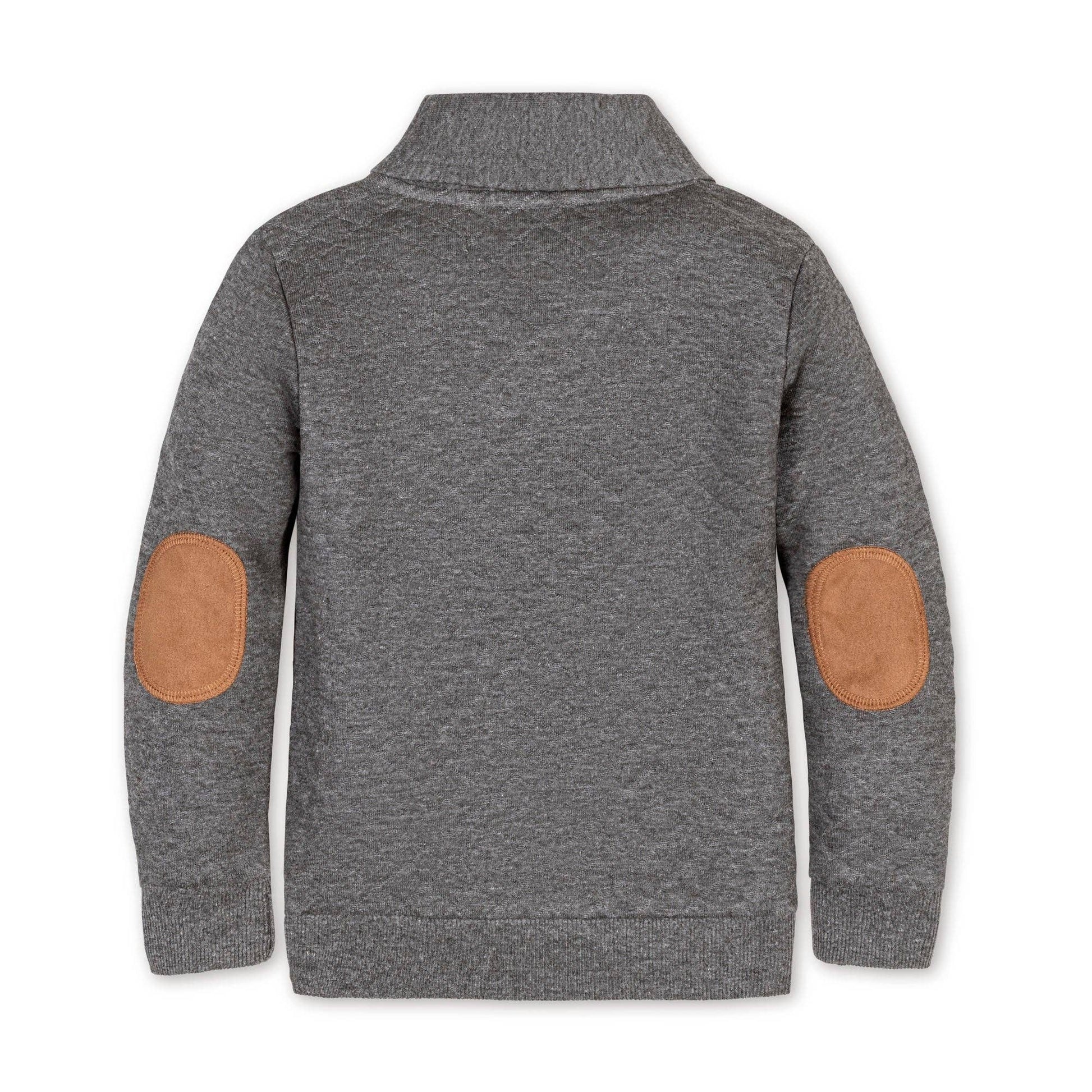 Our shawl collar sweatshirt in a soft organic cotton blend quilted fabric is the ultimate in comfort and style for your boy. Special attention to details such as the shawl collar with button closure and faux suede elbow patches make this an instant classic that can be worn on repeat and handed down time and again.