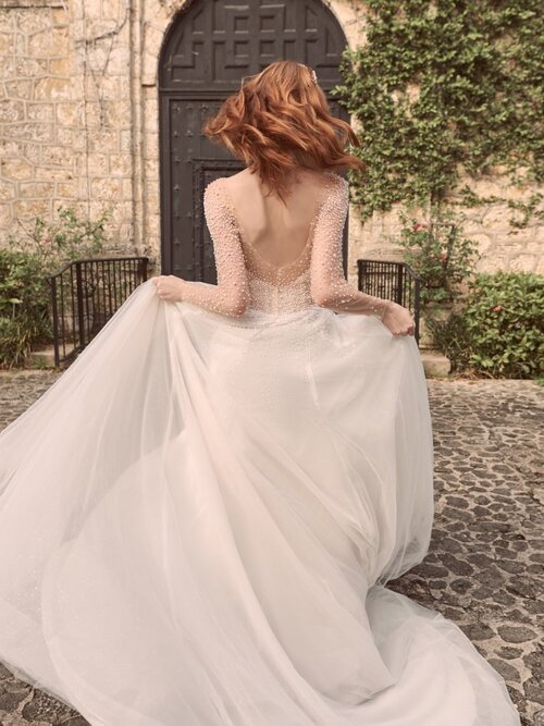 Fall in love with this romantic “Rosette” ballgown from Maggie Sottero. Featuring an exquisite beaded illusion bodice and long sleeves, this wedding gown evokes a Starry Night-inspired enchantment. Feel like a fairytale princess in this truly magical creation!
