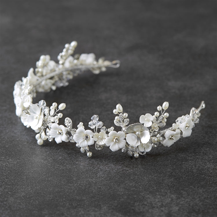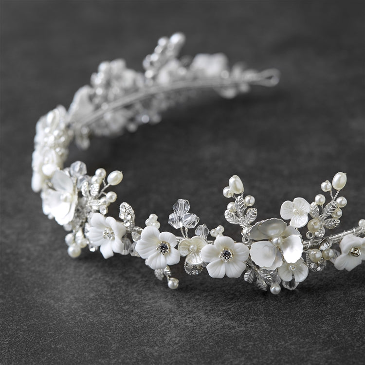 Silver Matte Floral Bridal Wedding Tiara Crown with Light Ivory Flowers & Freshwater Pearls