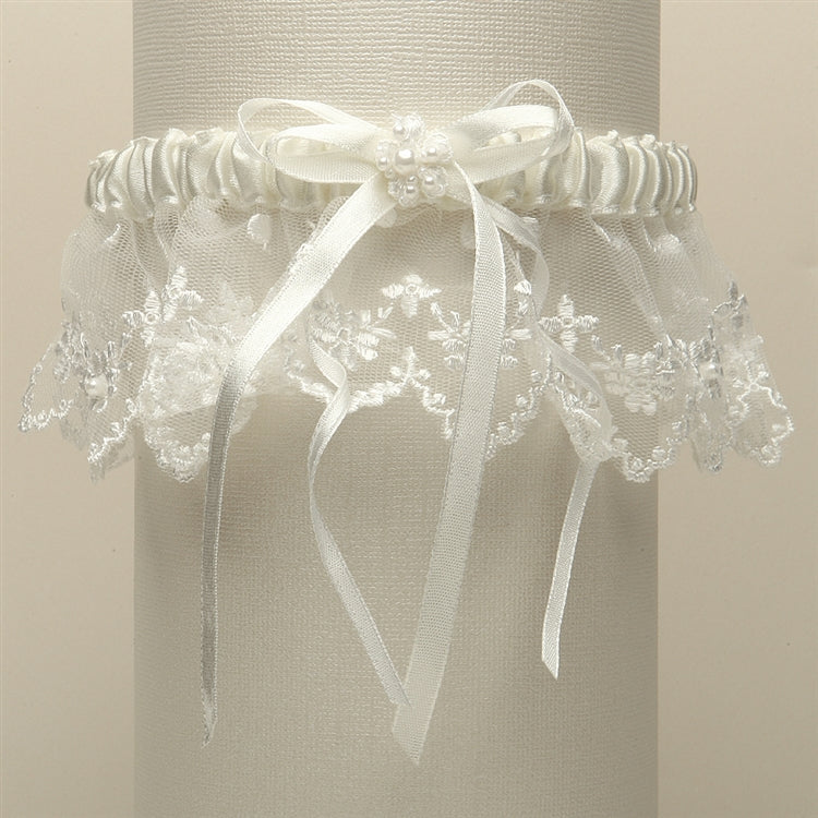 Mariell's European style Wedding Garters are inspired by Irish lace and feature a finely embroidered mesh fabric and a ruffled lace skirt. These exquisite bridal garters are adorned with baby pearls and feature a pearl studded applique flower on the ribbons. Our lovely boxed garters measure 2 1/2" h