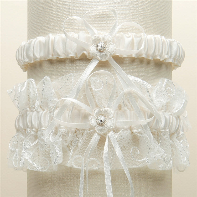 Vintage Wedding Garter Set with Floral Embroidered Tulle - Ivory