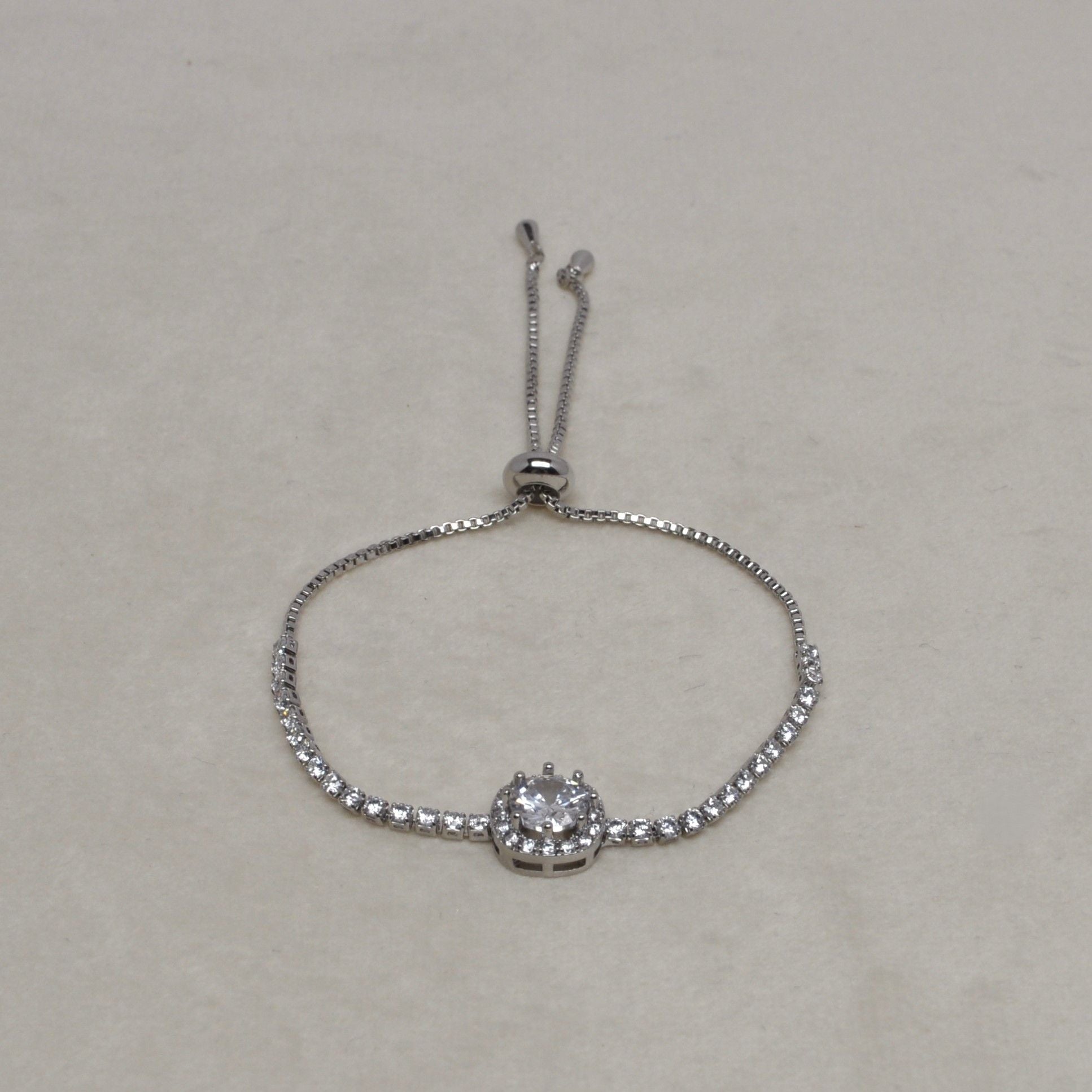 This round crystal bracelet features a central sparkling stone and an adjustable bolo closure, allowing for a perfect, customized fit. Its refined design combines subtle glamour with versatile elegance, making it an exquisite accessory for any sophisticated look.